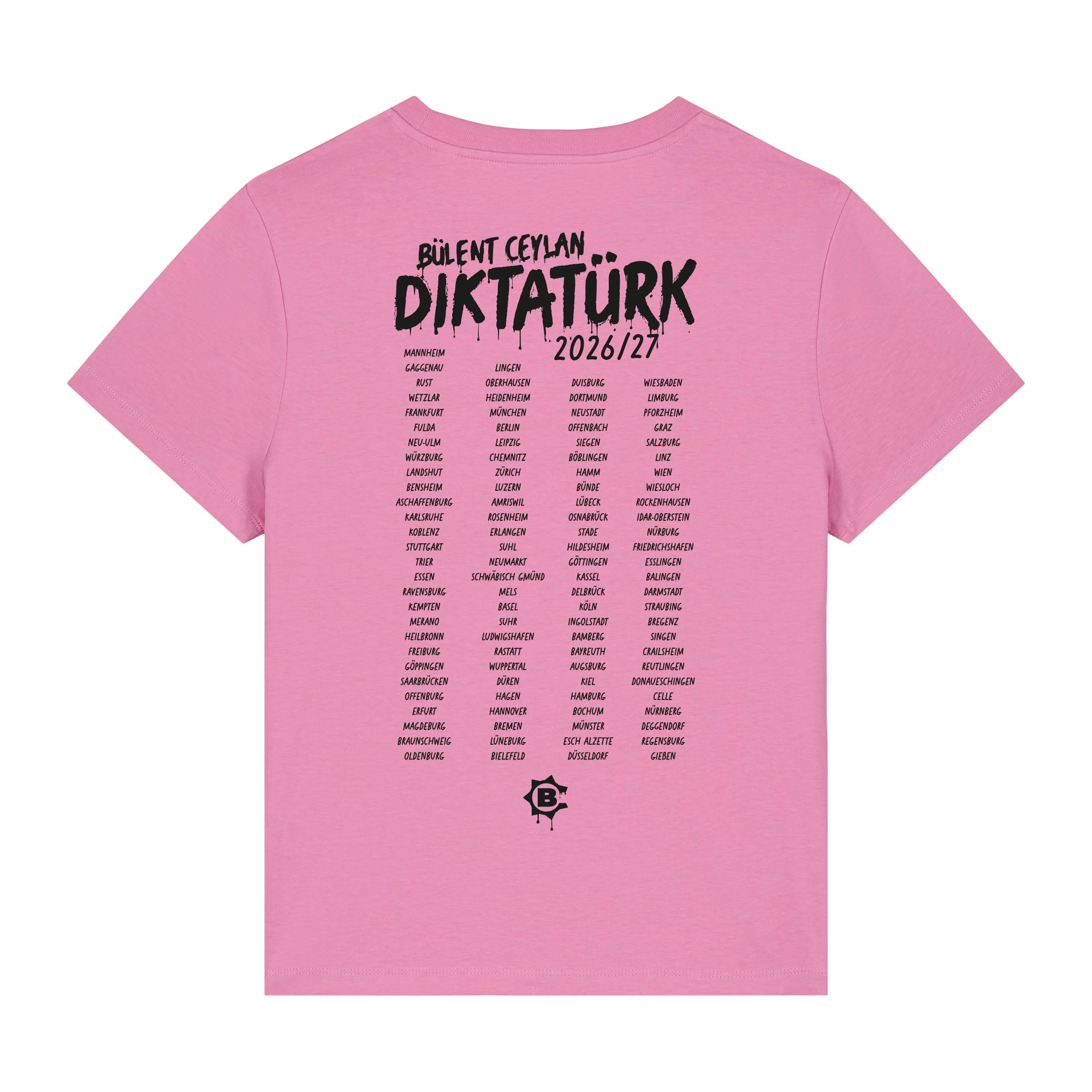Ladys Tourshirt "Diktatürk" in pink mit print in schwarz. Alle Tourstops sind auf der... mehr