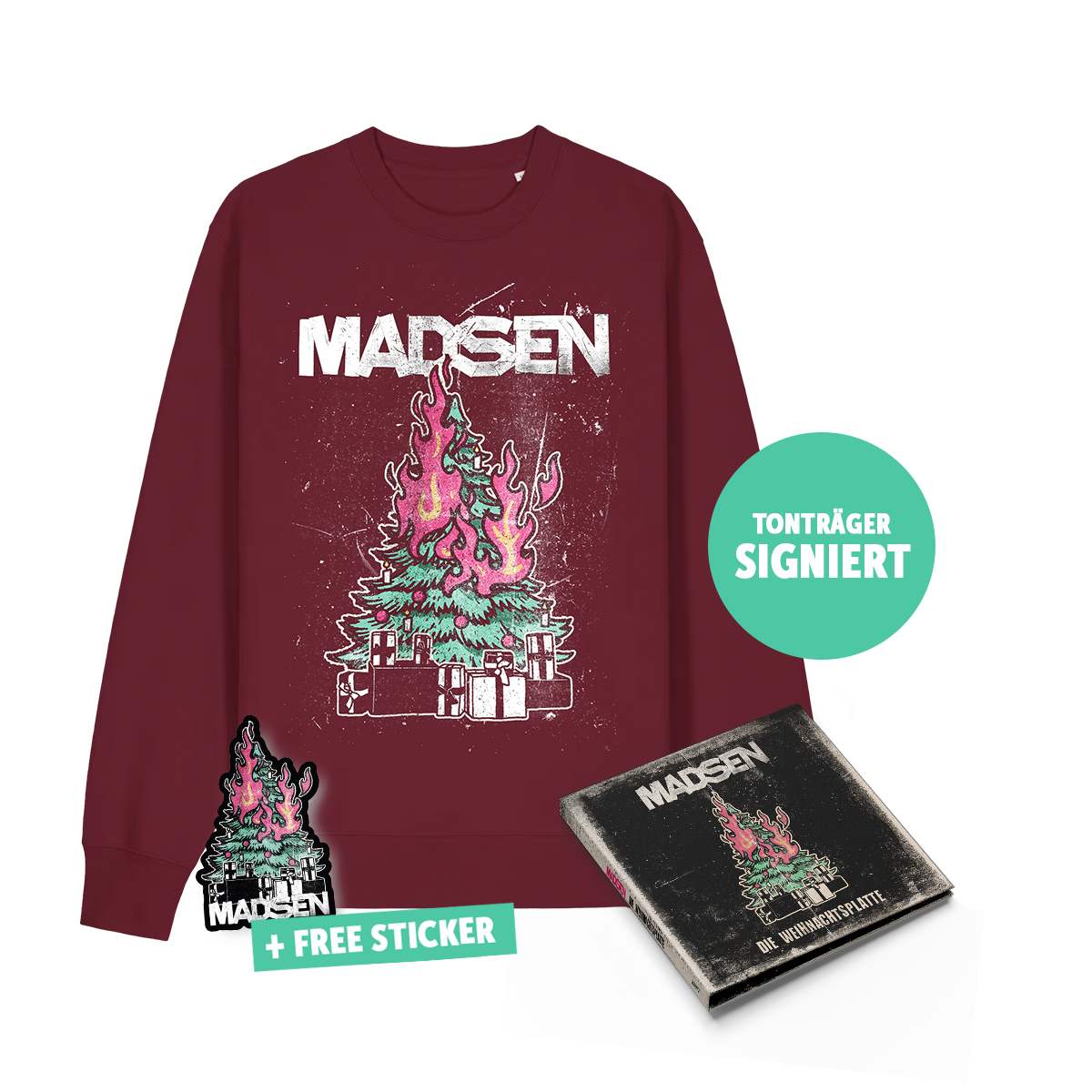 Damit ihr es euch die Weihnachtszeit besonders gemütlich machen könnt, haben wir dieses besondere Bundle zusammengestellt. Es besteht aus der Weihnachtsplatte als CD für den Soundtrack in der Adventszeit und dem neuen weihnachtlich-rotem Madsen Weihnachtspulli extra für die kalten Tage im Jahr. Der Tonträger wird handsigniert und es gibt noch einen Sticker for free dazu!