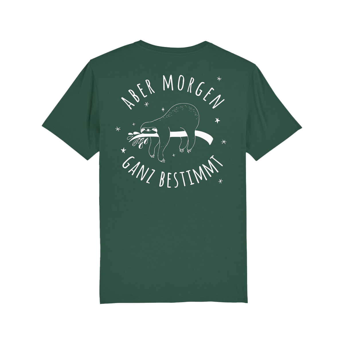 Grünes T-Shirt mit weißem Faultier-Logo als Pocketprint auf der Brust und großem Faultier-Motiv auf der Rückseite.