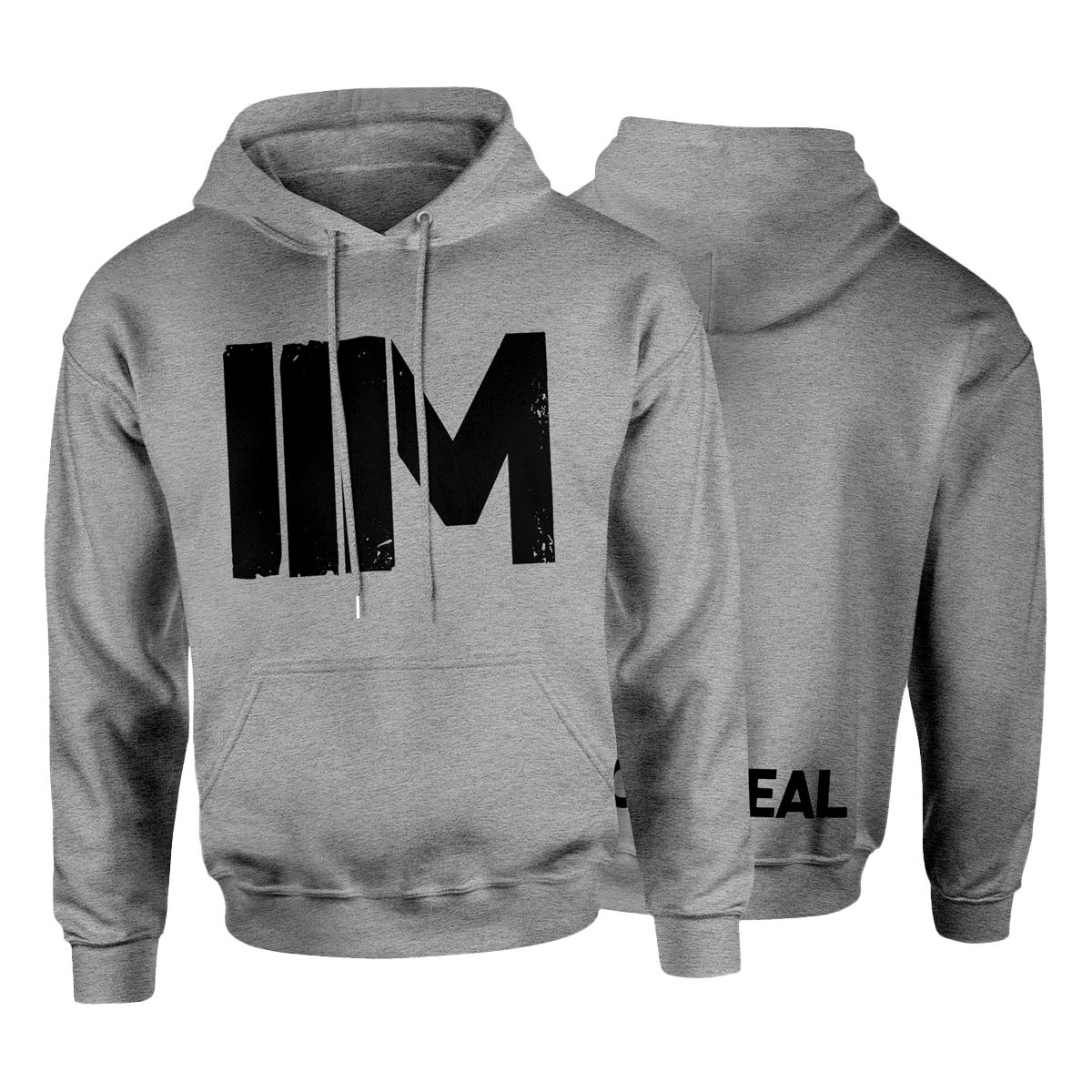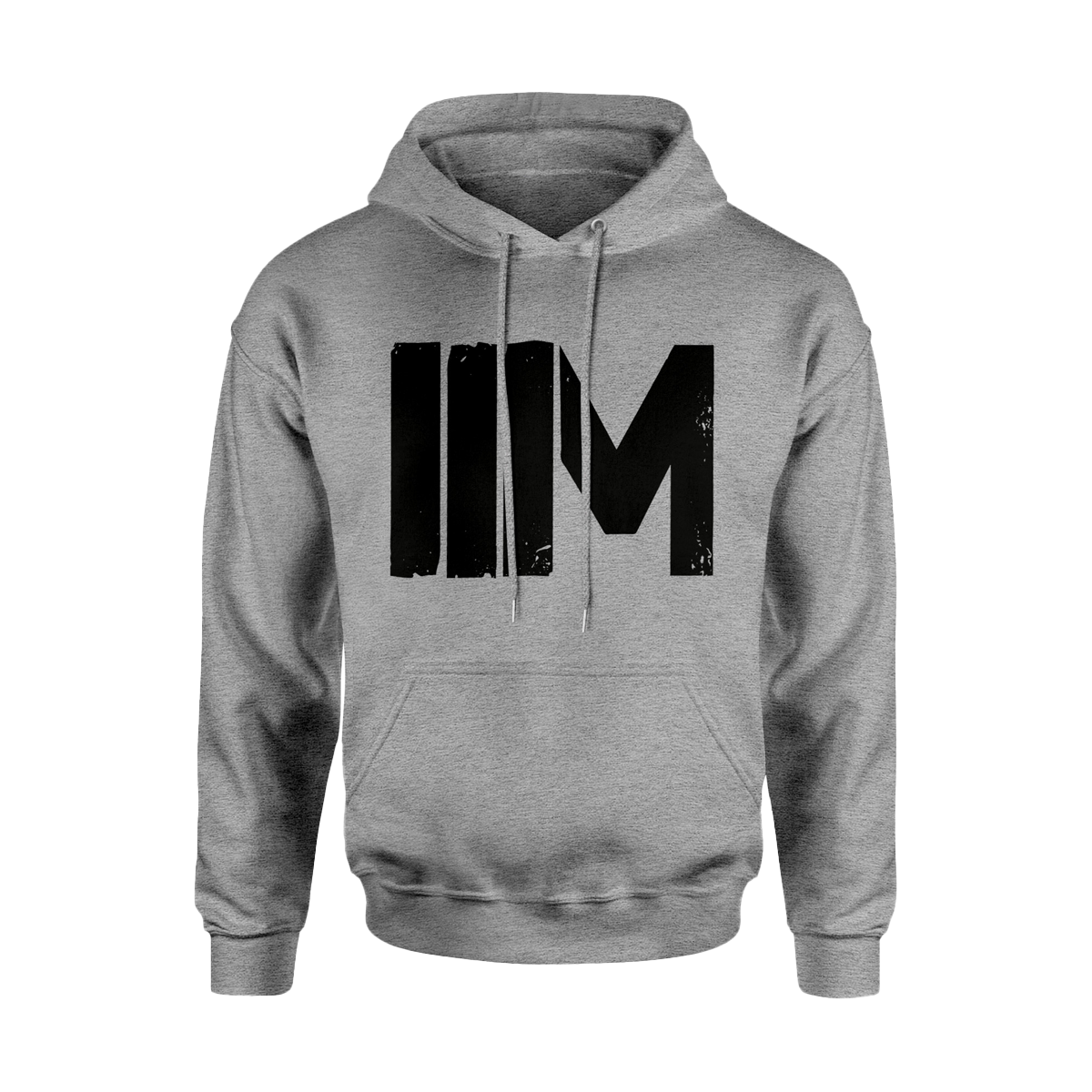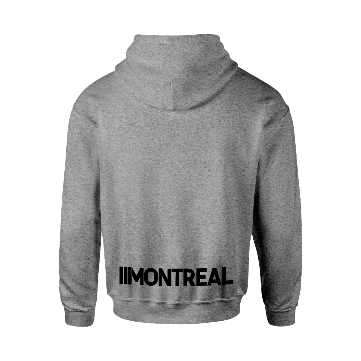 Grauer Hoodie mit schwarzem IIM-Motiv als Frontprint und schwarzem Montreal-Schriftzug am unteren Saum der Rückseite.