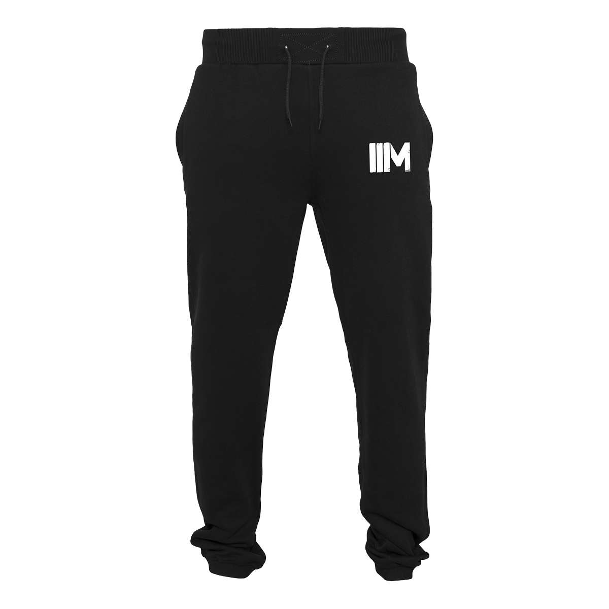 Schwarze Jogginghose mit weißem IIM-Motiv auf dem linken Oberschenkel.