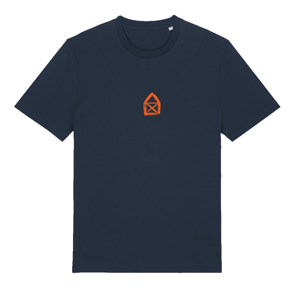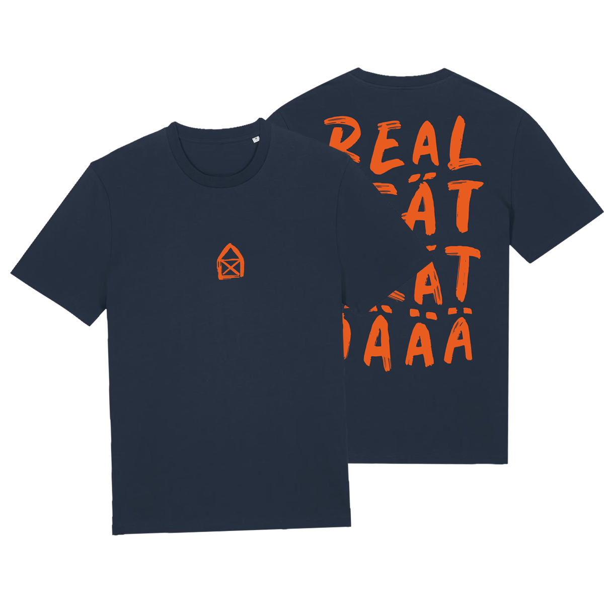 Unisex-Shirt in der Farbe french navy mit orangenem Print auf der Vorder- und Rückseite.