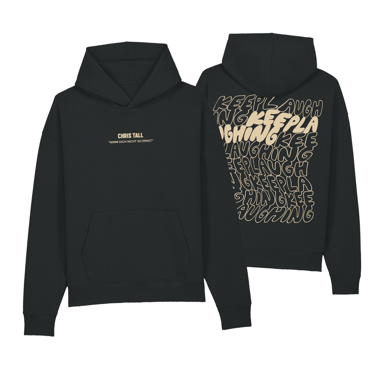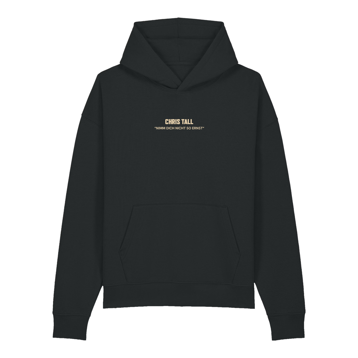 Schwarzer Hoodie "Nimm dich nicht so ernst" mit beigem Aufdruck.