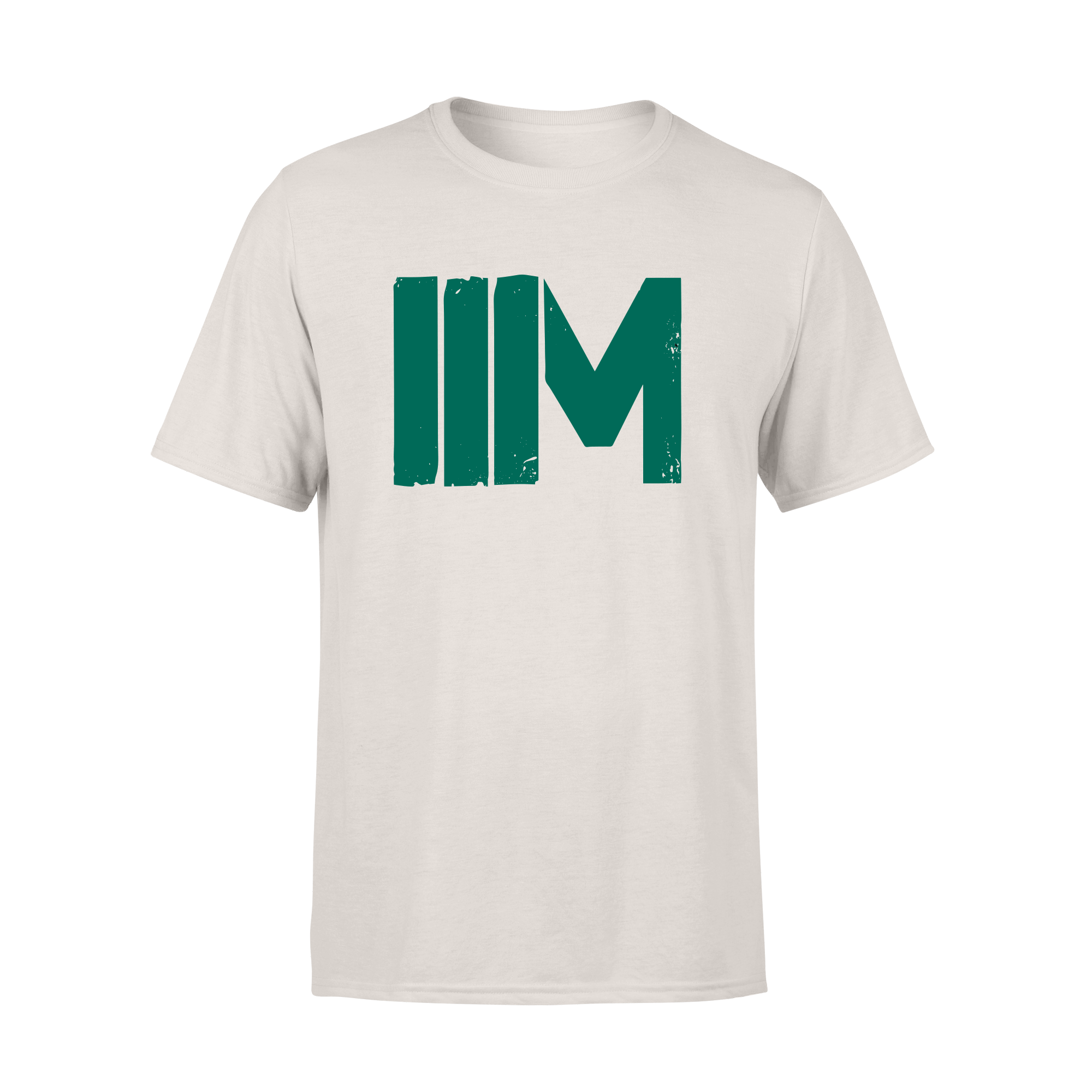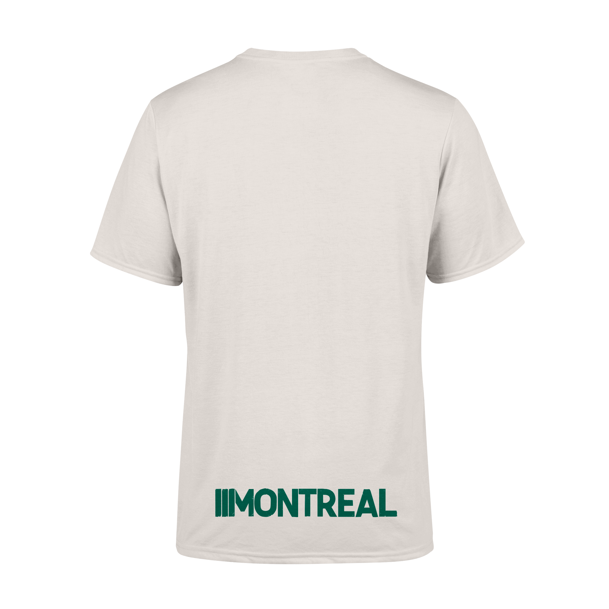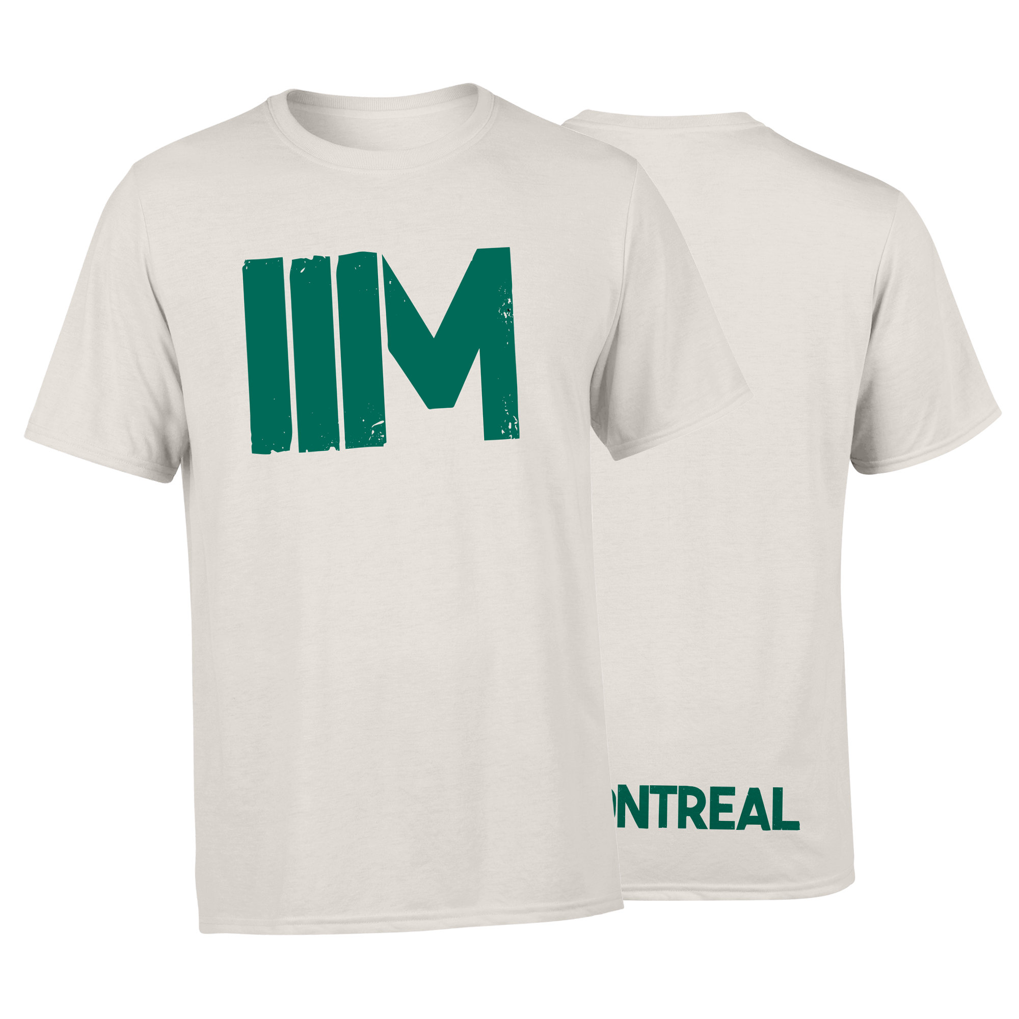 Weißes T-Shirt mit emerald IIM-Motiv als Frontprint und emerald Montreal-Schriftzug am unteren Saum der Rückseite.