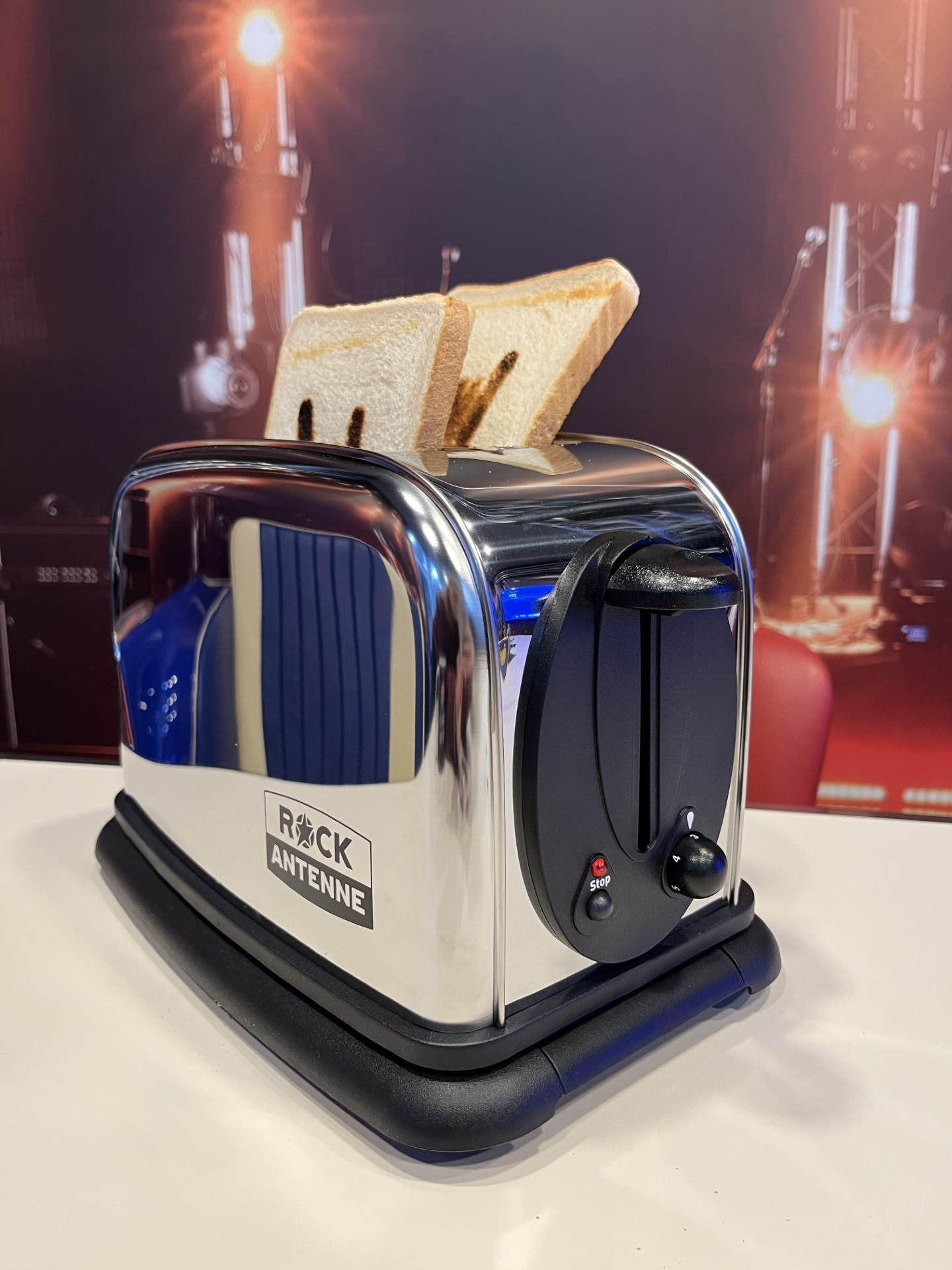 Ohhh… Sweet Toast O’ Mine… heißt es ab jetzt jeden Morgen mit dem ROCK ANTENNE Motiv-Toaster. Knusprig goldener Toast trifft auf eine markante Pommesgabel und setzt schon beim Frühstück ein klares Statement.